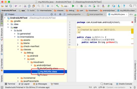 7.我们先build一下工程,检查myJNIUtils.java编译后有没有生成class文件,在这个位置下:
