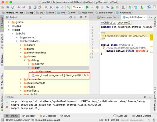 我们发现这个路径下多了个.h文件AndroidJNITest/app/build/intermediates/classes/debug/com/kissdream