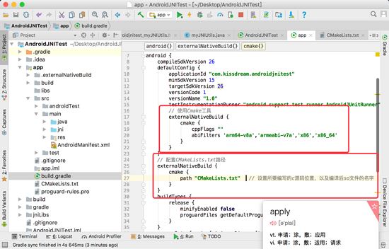 path "CMakeLists.txt" // 设置所要编写的c源码位置,以及编译后so文件的名字