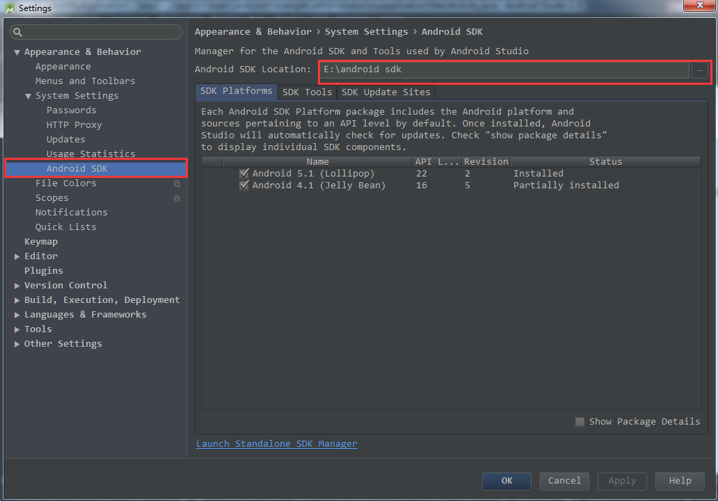 Android studio 中更改sdk的路径,如下图,在右边红色方框中更改sdk的路径