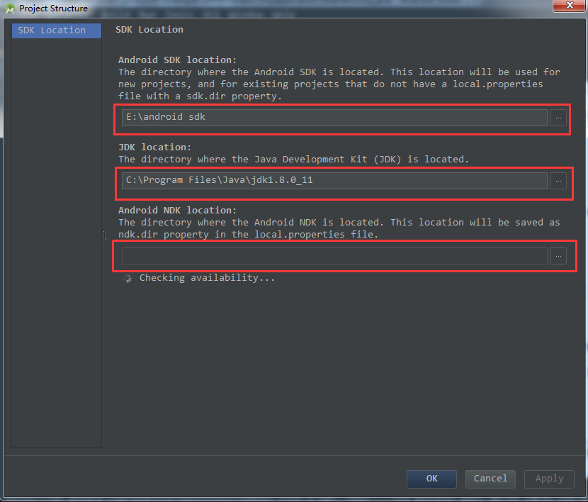 还有一种更好的方式可以把sdk,jdk,ndk的路径全部找到,首先File---Other Settings---Default Project Structure...,打开如下图界面,从红方框处即可直接更改sdk ,jdk,ndk的路径