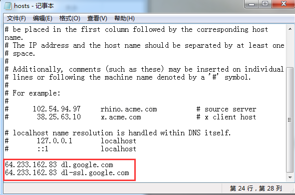 host文件在C:\Windows\System32\drivers\etc目录下,用记事本打开“hosts”文件,将下面两行信息追加到hosts文件末尾,保存即可。如果你的是windows8系统可能没有权限修改host文件,可以右击hosts文件,将Users组设置为可对hosts文件完全控制的权限即可