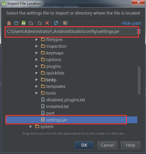 5,有新版本AS时,当我们升级完成AS后,想配置上个版本的一些设置,比如字体,颜色等其他设置时,如果要再次手动配置一遍,先不说记不记得住上个版本的配置,就算记得住,全部配置一遍也不是很快就搞定的事,所以我们要导入上个版本的设置,首先File-->Import Settings,弹出如下界面: