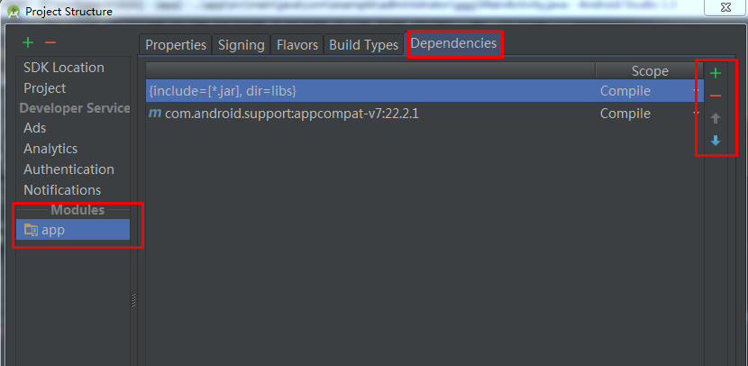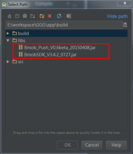 6,向android studio导入jar包时,如果只把jar包复制粘贴到项目的libs目录,是不能使用jar包的sdk的,这点感觉没有eclipse好用,AS必须要找到复制进去的jar包并导入才能用,下面是完整的向android studio 导入jar包的步骤: