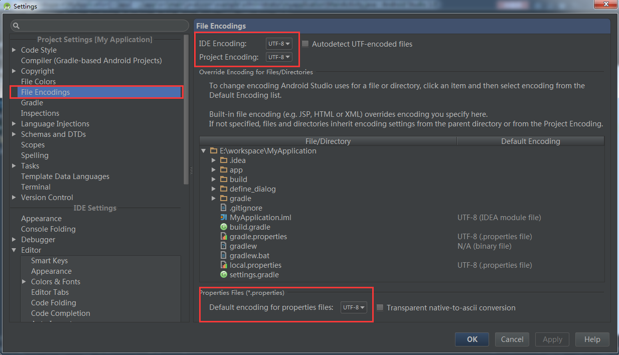 还有一种情况,代码里设置中文,到了真机上TextView之类的控件上就显示为乱码,如:xx.setText("你好"),或者在其他开发工具里正常显示的代码注释到AS中就变成乱码,解决方法为:File -- > Settings 里找到File Encodings (每个版本的 Android studio各个选项的位置都不一样,但是肯定都有,在左上角查找框里输入File Encodings ,可直接定位),在红色框框起来的地方全部改为UTF-8,再部署一遍应用即可解决问题
