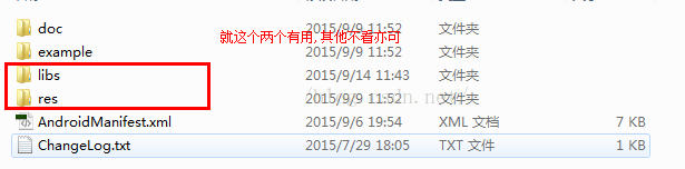 liibs目录里存放的是推送的jar包和支持手机架构的后缀为.so的库文件,res目录里存放的是一些xml文件,和一些图片,这些文件时为了接收富媒体消息用的,res目录里的文件直接拷贝到相应目录即可,libs目录里的文件就是要主要讲的.