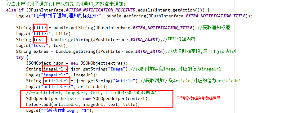 以上2个action和3个常量就能完成客户端接收推送部分百分之80的部分,而我的demo就是根据这2个action和3个常量做出来的,下面是具体怎么使用这些action和常量的截图: