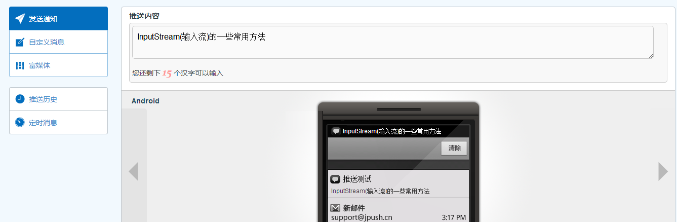 这篇文章结尾有我自己写的一个demo,大家可以去下载看看,就是下载积分有点多,绝对不是官方自动生成的demo,要说唯一的相同点,就是设置免打扰时段是直接复制过来的,之前被极光折磨时,也找了很多demo子看看,但是那些demo要么是官方原版,要么是稍微改动一下,依然换汤不换药.还花了我很多积分,并且标题还说是自己写的demo,我就呵呵了,真的很没有良心,我的这个demo不能说多好,但至少不是官方demo并且界面做的还算可以,至少我自己这样认为.再说一点,我的demo或者这篇文章,差不多适合想用极光推送但不知从何下手的新手,或者像我这样被虐了很多遍的人,如果你想问服务器端怎么写,那这篇文章和demo不适合你,估计你的水平已超过了我,这篇文章主要说利用普通推送,废话说完,进入正题.