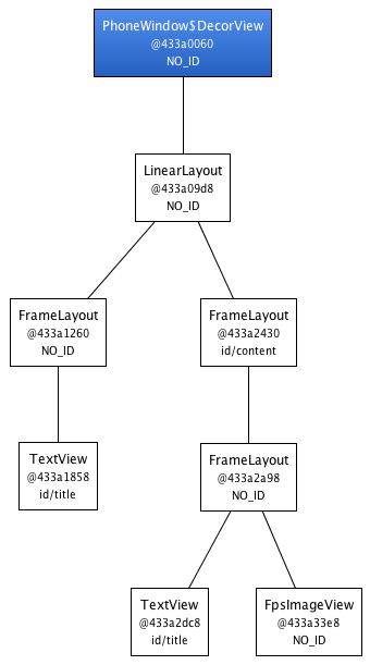 先看看 Activity 的层次结构:我们用的 Activity 的 xml 的根 View 并不是 Activity 的根 View ,在它上面还有一个父 View, id 是 android.R.id.content,再向上一层,还有一个view,它是一个 LinearLayout,它除了放置我们创建的 View 之外,还放置我们的 xml 之外的一些东西比如放 ActionBar 或者标题栏什么的。而再往上一级,就到了 Activity 的根 View —— DecorView,结构