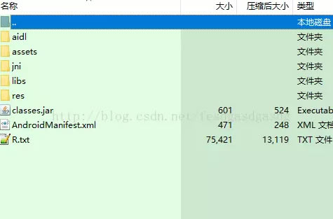 如图:把aar文件用WinRAR等压缩软件打开后,会发现是上面的结构,classes.jar即为class文件的jar包,其他的为android相关的资源文件。