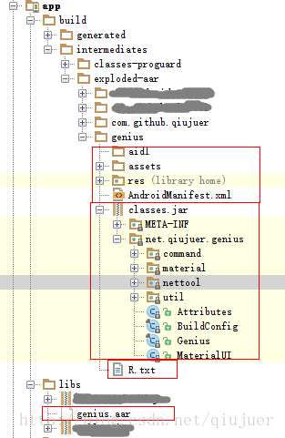 这时打开你的项目地址”\build\intermediates\exploded-aar\“你会发现下面多了一个文件夹”genius“打开后能看见里边包含了一个”classes.jar“文件与一些资源文件和”R.txt“文件。