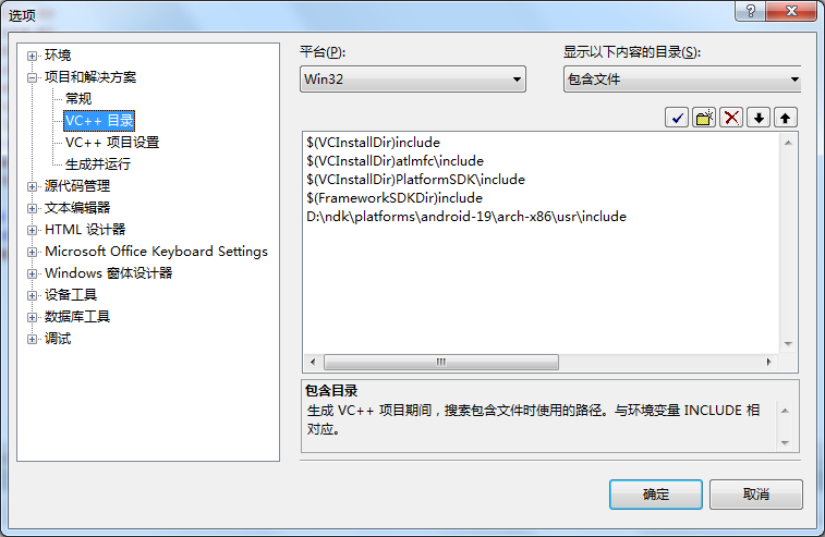 这里主要是把NDK开发的include目录包含进来, 打开vs“工具”-“选项”-“项目和解决方案”-“VC++目录”,设置包含文件目录新增“D:\ndk\platforms\android-19\arch-x86\usr\include”: