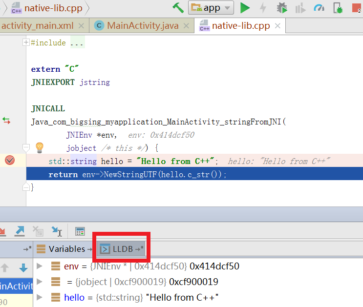 默认的工程属性不用配置,debugger默认为auto会自动适配,直接在cpp里下断点,调试方式运行App,会自动断下,变量数值均能在调试状态下看到。
