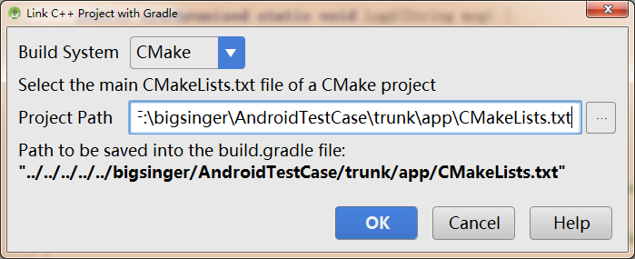 然后是指定CMakeLists.txt文件的路径,这里可以复制新建项目的CMakeLists.txt文件到现有项目的app目录下,把它放到和proguard-rules.pro相同的文件夹下即可。然后把这个CMakeLists.txt文件的全路径输入进去,点OK。