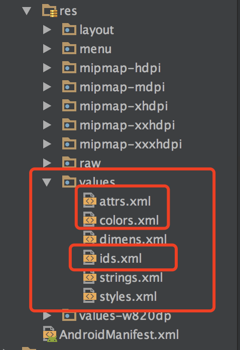 2.4 拷贝或合并文件内容attrs.xml/colors.xml/ids.xml三个文件。