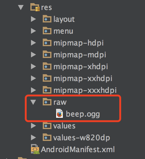 2.3 拷贝资源目录raw至本项目中,beep.ogg是扫描成功时的提示音。