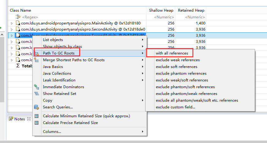如上图所示, 其中内存中还存在 6个SecondActivity实例,但是我们是想要全部退出的,这表明出现了内存泄漏