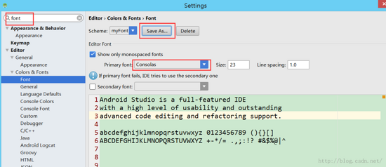 字体设置,搜索栏搜索font,直接修改,下方实时预览,建议修改后点击save as 保存一份