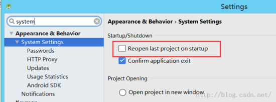 有些朋友想一打开as就直接进入项目,跳过选择项目的启动界面,取消勾选reopen lase project即可
