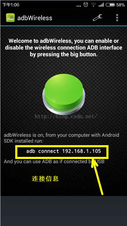 3.进入该app,界面如下,点击中间那个很大的按钮,下方会出现连接信息: