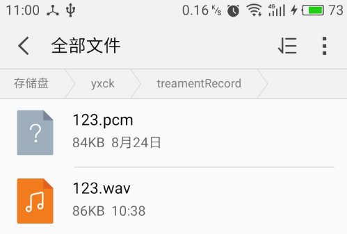 Demo 把手机内存卡上 /sdcard/yxck/treamentRecord/ 的123.pcm转换为123.wav文件。