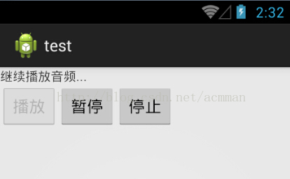 布局文件,包括一个文本信息显示控件和三个按钮(播放、暂停/继续和停止按钮)