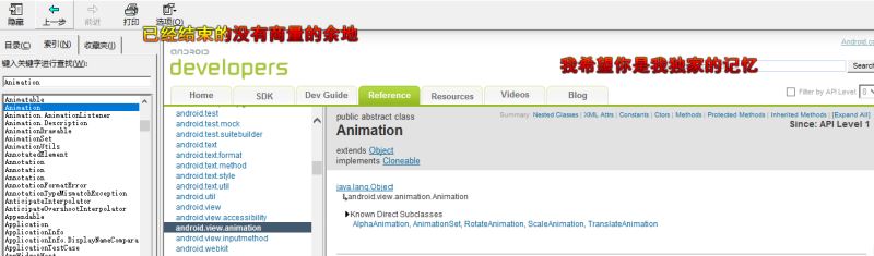那么我就思考了下,就用了android 的一个动画类Animation...其实在Android 的API开发文档上就有的一个东西。自己可以去查下看。就像下面的这个图上面的一样的。也是属于界面View 下的一个类方法...