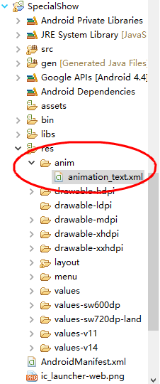 看到了么,就是这样的,在你的Android项目下的存放资源的那个文件夹中新建一个anim文件夹,再新建一个animation_text.xml