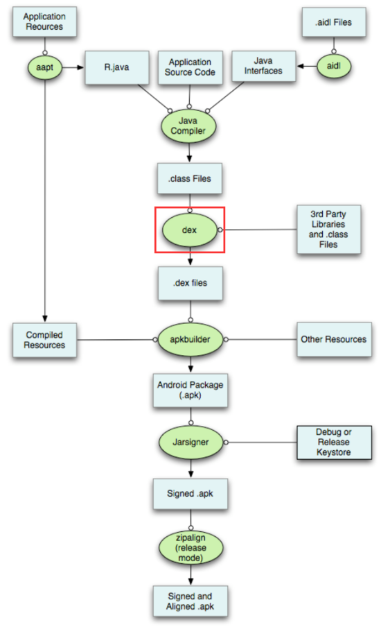 如图所示是Android打包流程,.java文件->.class文件->.dex文件,只要在红圈处拦截住,拿到所有方法进行修改完再放生就可以了,而做到这一步也不难,Google官方在Android Gradle的1.5.0 版本以后提供了 Transfrom API, 允许第三方 Plugin 在打包 dex 文件之前的编译过程中操作 .class 文件,我们做的就是实现Transform进行.class文件遍历拿到所有方法,修改完成对原文件进行替换。