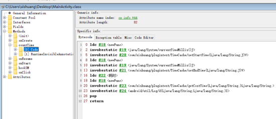 在一个方法的前后插入时间统计的方法,这个具体的过程要怎么操作呢,因为class文件是字节码格式的,ASM也是进行字节码操作,所以必须先把插入的代码转换成字节码先。这里推荐一个字节码查看工具Java Bytecode Editor,导入.class文件就可以看到对应字节码了。
