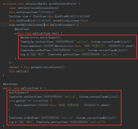 以上就是总体的思路了,现在就通过 Luffy 根据具体需求实战一下,比如说在onClick方法点击的耗时(自动埋点也是一样的道理,只不过换了插桩的方法)。