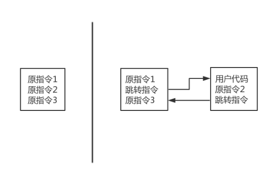 首先将目标指令替换为跳转指令,跳转地址为一段我们自己编写的汇编代码,这段汇编代码先是执行用户指定的代码,如修改寄存器的值,然后执行被替换掉的原指令2,最后再跳转回原指令3处,恢复程序的正常运行。