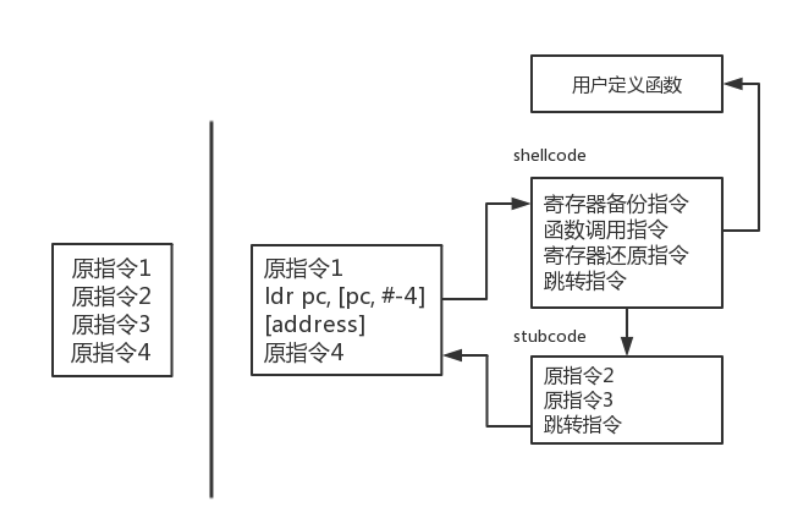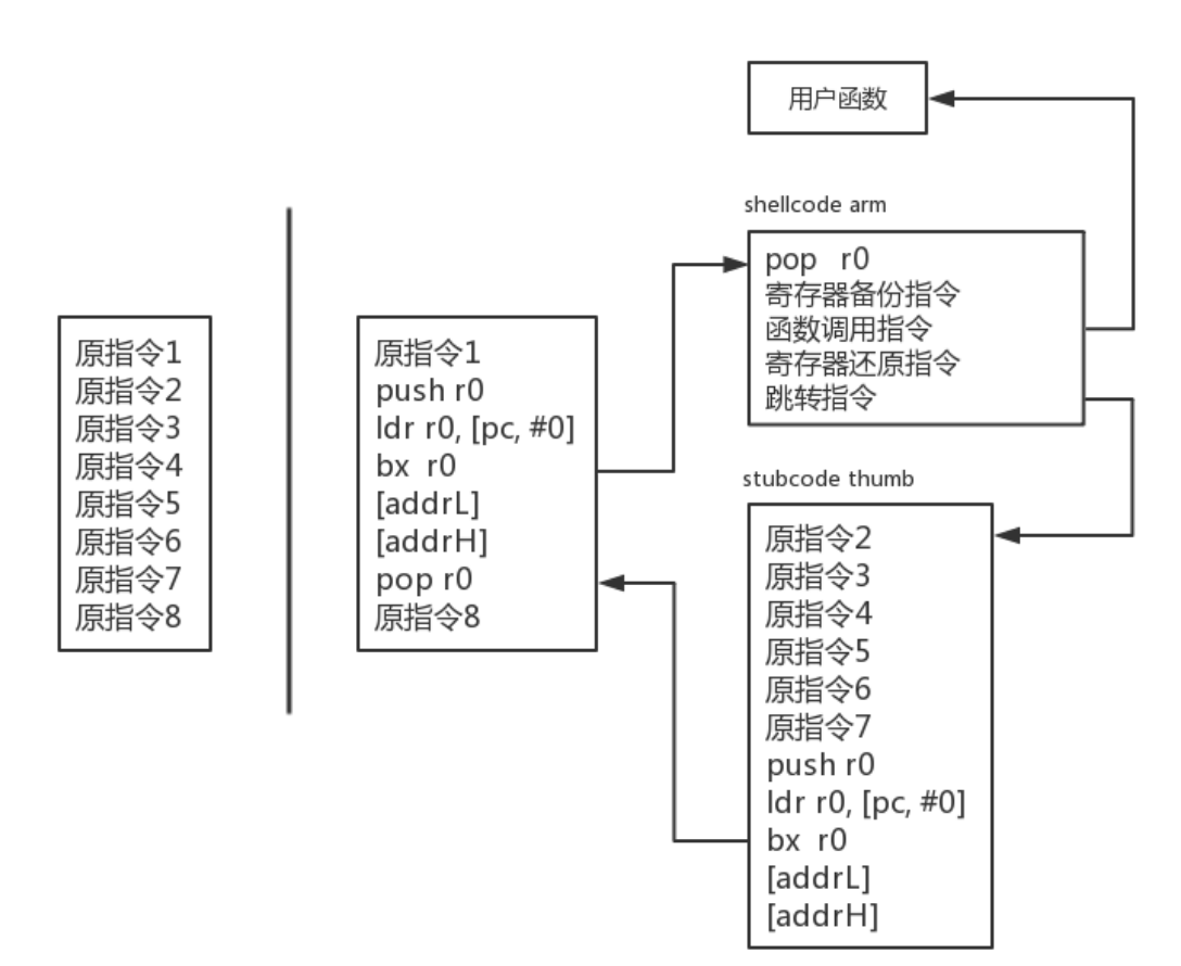 为了实现32位地址空间的长跳转,我们需要两条指令的长度(8个字节)来实现。一般手机上的arm处理器为3级流水,所以pc寄存器的值总是指向当前执行指令后的第二条指令,因而使用ldr pc, [pc, #-4]来加载该指令之后的跳转地址。当程序跳转到shellcode后,首先对寄存器组进行备份,然后调用用户注册的回调函数,用户可在回调函数中修改备份中各个寄存器(pc寄存器除外)的值,然后从备份中恢复寄存器组再跳转到stubcode,stubcode的功能是执行被hook点的跳转指令替换掉的两条指令,最后跳回原程序。