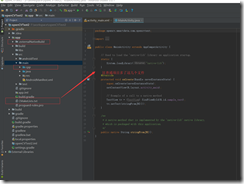 现在就可以在src/main/java/*/MainActivity.java中按照同样的方法,载入库,写上方法声明。最后,如下所示。