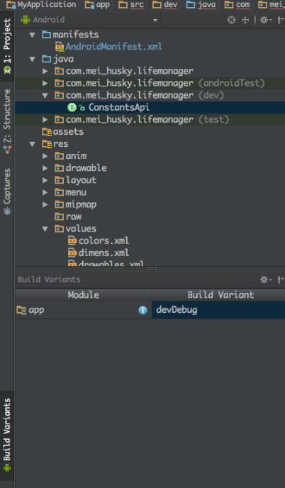 比如我的工程src/main下面结构可能是这样: - /MyProject/MyApplication/app/src/main/java/com/mei_husky/lifemanager 那么src/dev文件夹下的目录结构最好也是: - /MyProject/MyApplication/app/src/dev/java/com/mei_husky/lifemanager