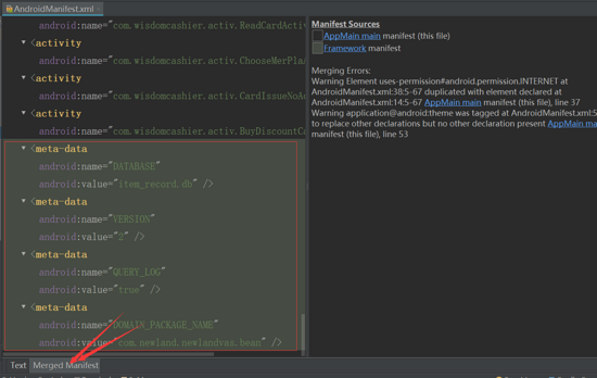 比如我打开AppMain的manifest,选择下面的Merged Manifest 模式,就可以看到最终合并结果了。