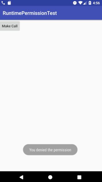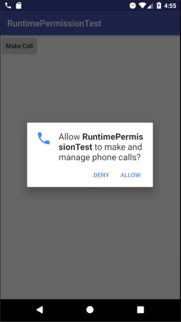 <?xml version="1.0" encoding="utf-8"?> <manifest xmlns:android="http://schemas.android.com/apk/res/android" package="com.example.runtimepermissiontest"> <uses-permission android:name="android.permission.CALL_PHONE" /> <application android:allowBackup="true" android:icon="@mipmap/ic_launcher" android:label="@string/app_name" android:roundIcon="@mipmap/ic_launcher_round" android:supportsRtl="true" android:theme="@style/AppTheme"> <activity android:name=".MainActivity"> <intent-filter> <action android:name="android.intent.action.MAIN" /> <category android:name="android.intent.category.LAUNCHER" /> </intent-filter> </activity> </application> </manifest>