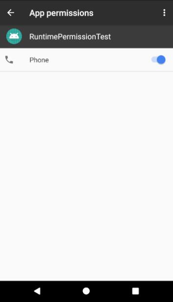 可以看到,这次我们就成功进入到拨打电话界面了,并且由于用户已经完成了授权操作,之后再点击Make Call按钮就不会再弹出权限申请对话框了,而是可以直接拨打电话,那可能你会担心,万一以后我又后悔了怎么办?没有关系,用户随时都可以将授予程序的危险权限进行关系,进入Settings-->Apps-->RuntimePermissiontTest-->Permissions,界面如图:
