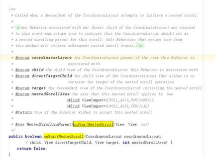 onStartNestedScroll:这个方法主要用于监听协调布局的子view的滚动事件,当此方法返回true,表示要消耗此动作,继而执行下面的 onNestedPreScroll 方法,我们在代码中返回的是,滚动轴是不是竖直滚动轴。如果是的话,就返回true