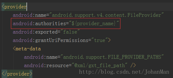 记住,provider标签的authorities属性的值一定要是唯一的,如果两个app的authorities属性值一样,就会提示安装失败,一定要记住!!