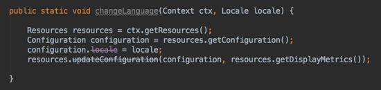 可以看到 configuration.locale 属性和 updateConfiguration 方法都已经被打上了废弃的标记。7.0系统推出后告诉开发者方法已经过时,到了8.0系统上这段代码就已经完全不好使了,所以才出现了前面提到的问题。