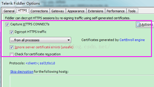 勾选CaptureHTTPS CONNECTs,点击Actions,