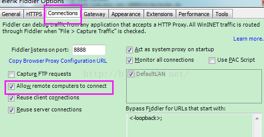 上一步窗口中点击Tools->TelerikFiddler Options->Connections,勾选allow remote computers to connect,默认监听端口为8888(下图Fiddler listens on port就是端口号),若端口被占用可以设置成其他的,配置好后要重新启动fiddler,如下图: