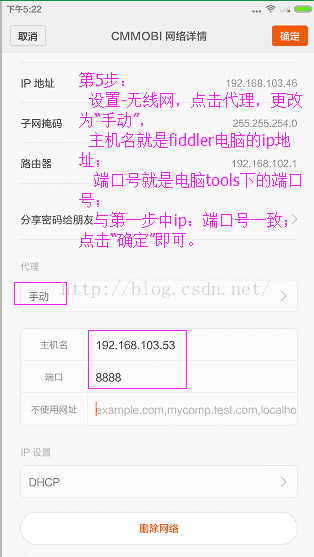 手机系统设置-无线网-点击高级,代理选择手动,主机名就是fiddler的电脑ip地址,端口号,就是fiddler的端口号,与浏览器中ip:端口号保持一致,点击确定即可,