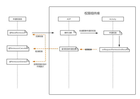 首先,先定义一个说法,弹出系统权限弹窗,用户没有给权限,并且选中不再提示,这种情况称为权限被拒绝;如果用户没有给权限,但是没有选中不再提示,这种情况称为权限被取消。申请权限、权限被取消、权限被拒绝都是采用注解的形式,分别为@NeedPermission、@PermissionCanceled、@PermissionDenied,注解都是声明在Method级别上的。在我们的Activity、Fragment及Service中声明注解,然后在AOP中解析我们的注解,并把申请的权限传递给一个透明的Activity去处理,并把处理结果返回来。这就是整体思路,可能会遇到的问题: