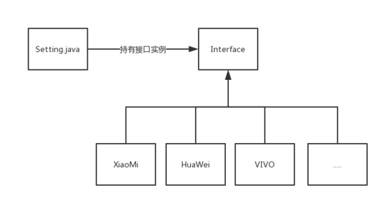 当用户拒绝权限并选中不再提示后,需要引导用户去设置界面打开权限,因为国产手机各个设置界面不一样,用通用的API可能会跳转不到相应的APP设置界面,这里采用了策略模式(下图所示)