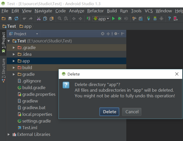 再次在“app”上点击右键,出现“delete”选项,点击“delete”,将其从“Test”项目列表中彻底移除(此时真正的从硬盘移除)