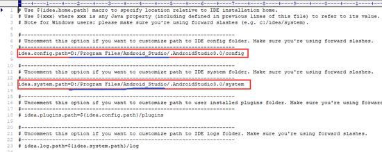 进入Android Studio 安装目录,进入 bin 文件夹,打开 idea.properties ,顶部,去掉以下两项的注释符号 # ,修改对应的新路径即可,我这边是已经更改过的