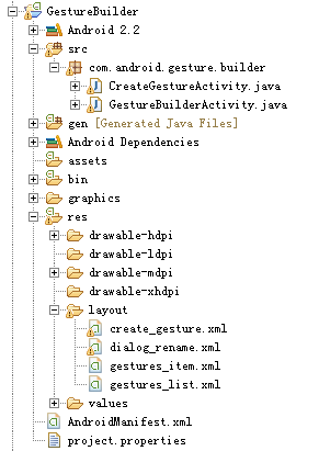 首先,在使用手势识别之前,我们需要建立一个手势库,创建手势库,我们可以找到sdk自带的实例程序,比如我本地的路径为sdk\samples\android-18\input\gestures,找到这个程序,然后建立一个新项目,将其整合之后,就可以用于产生手势库。