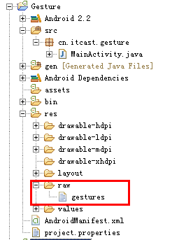 产生的手势库,默认存放在sd卡的根目录下面,我们将生成的手势库文件放在我们的raw目录下面